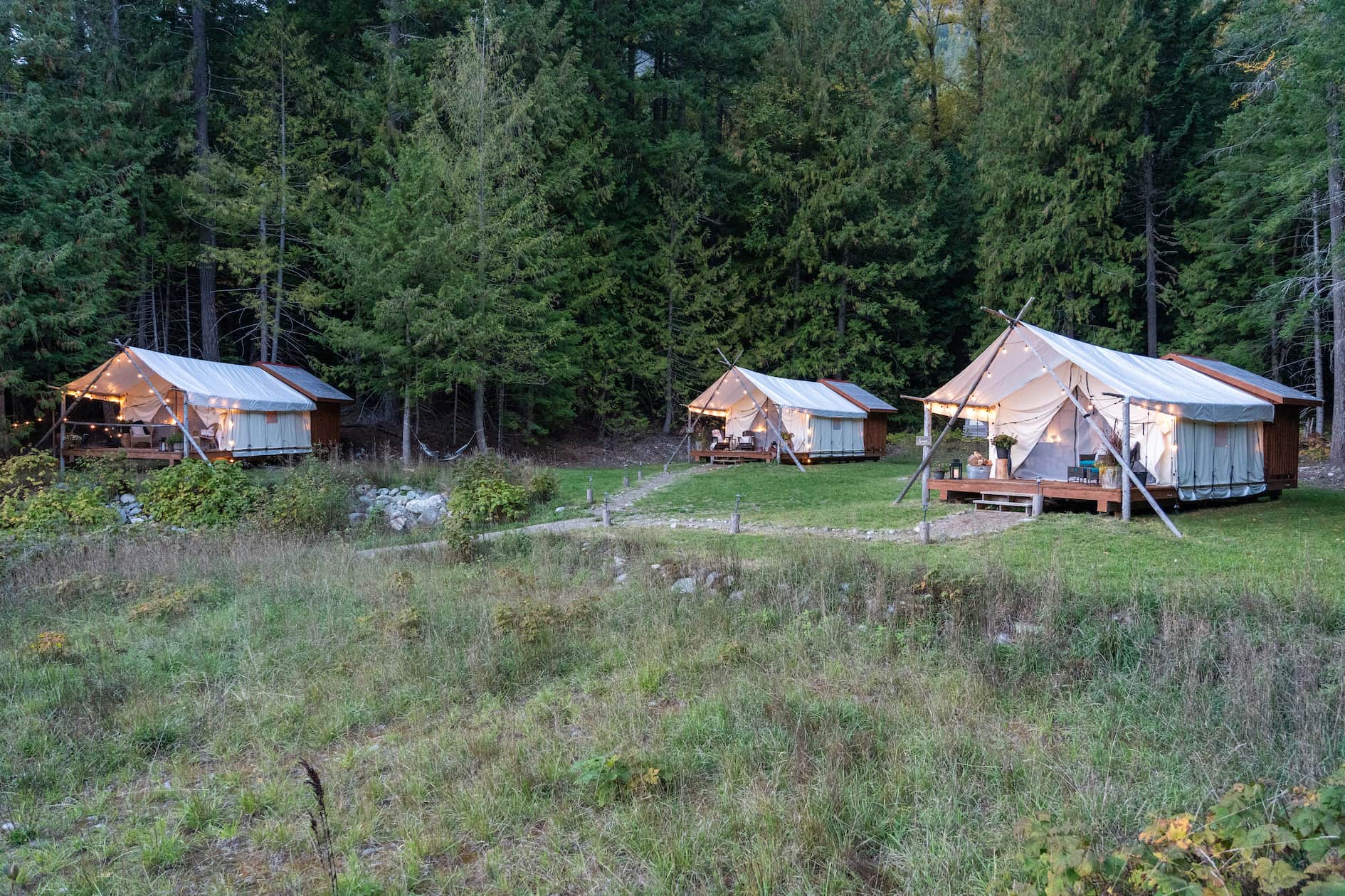Our glamping tents offer heated en suite bathrooms with semi-outdoor hot showers, wood burning stoves, Comfortable queen beds with down duvets and cotton sheets, towels, robes, WIFI, electricity, a private 8 by 14 covered private porch and use of the BBQ pavilion for dining, meal prep and storage