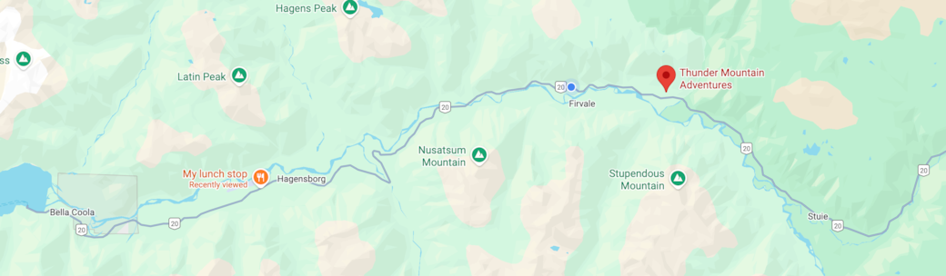 We are located at 4950 Mackenzie Hwy 20 in the Bella Coola Valley, about 1km west of the Tweedsmuir Provincial park'swest boundary entrance on the north side of the road. There is a small woodensign at the driveway entrance
