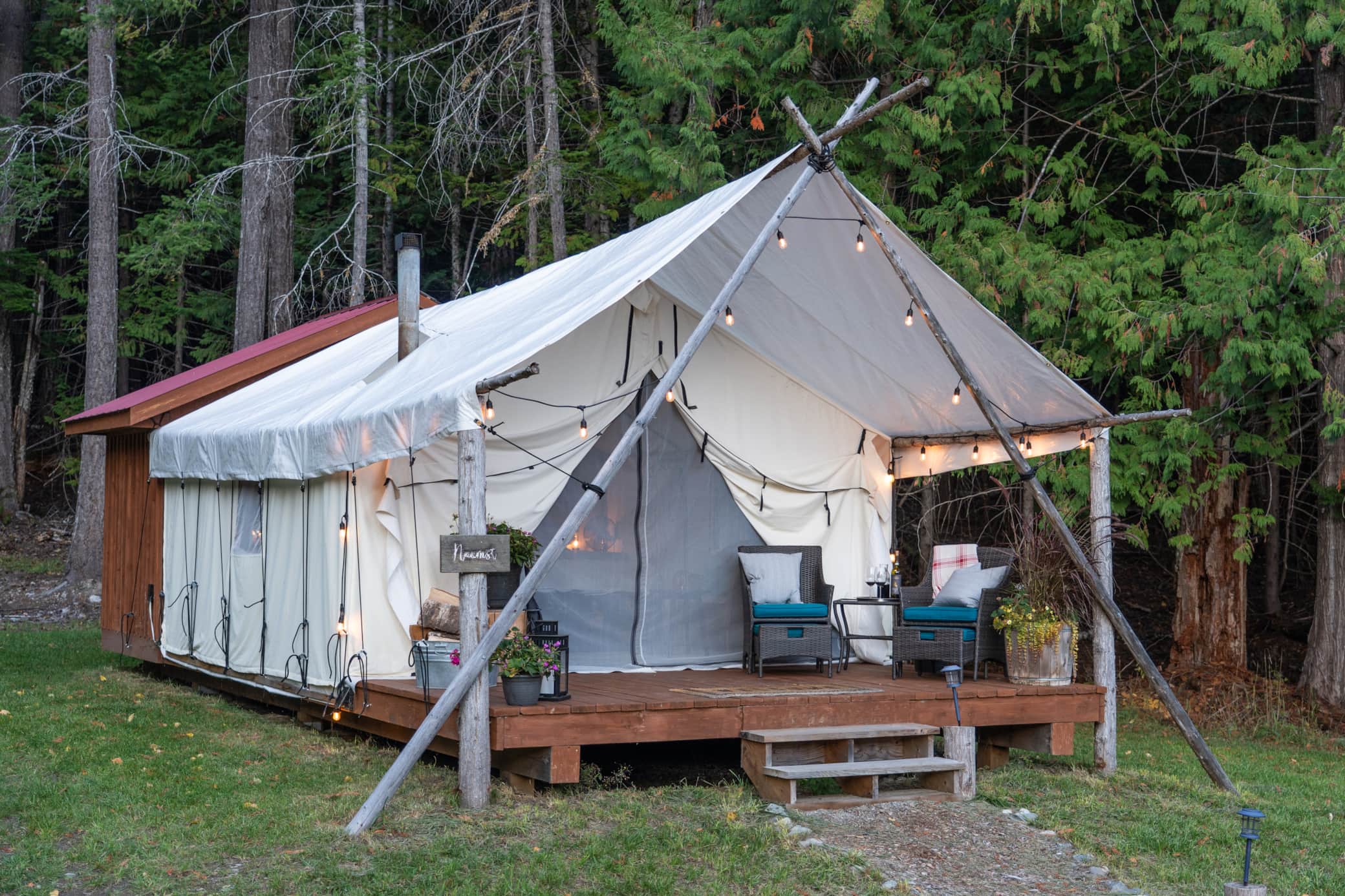 Noomst Wall tent is a comfortable 16 x 14 luxury wall tent with an 8' extended awning and an ensuite bathroom. The bathroom has a sink and toilet and has access to a private outdoor shower with views of the Douglas fir tree tops above you. The 14' x 8' private porch offers views over the property and the Coast mountains. The wall tents have access to the BBQ pavilion to prepare and store food.Â